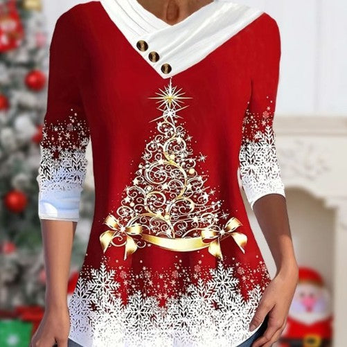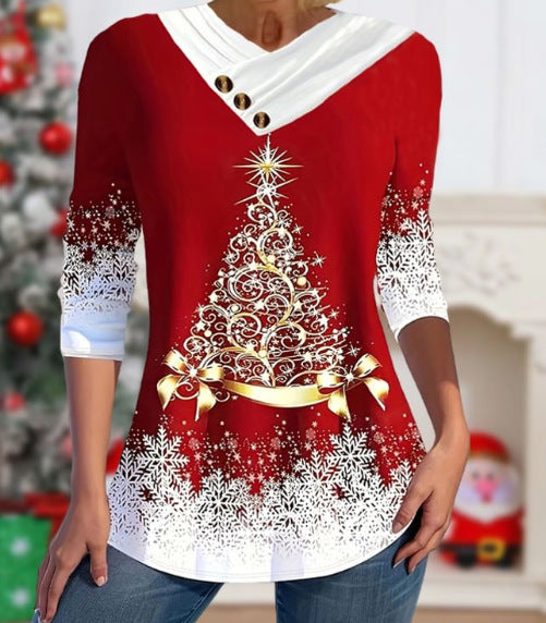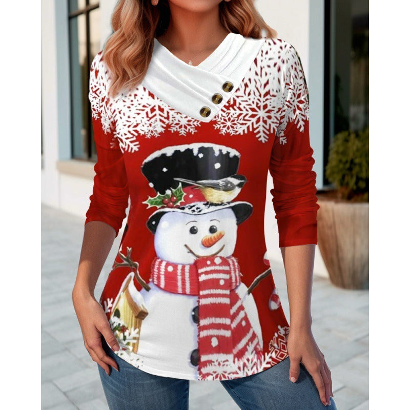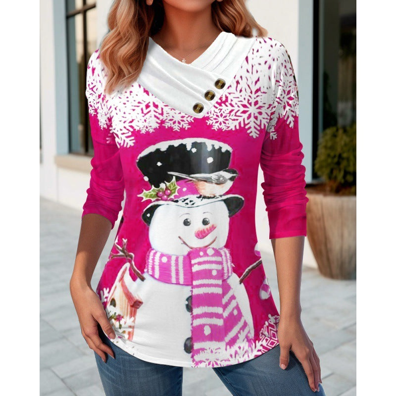 Christmas Snowman Printed V-neck Long Sleeve T-shirt
