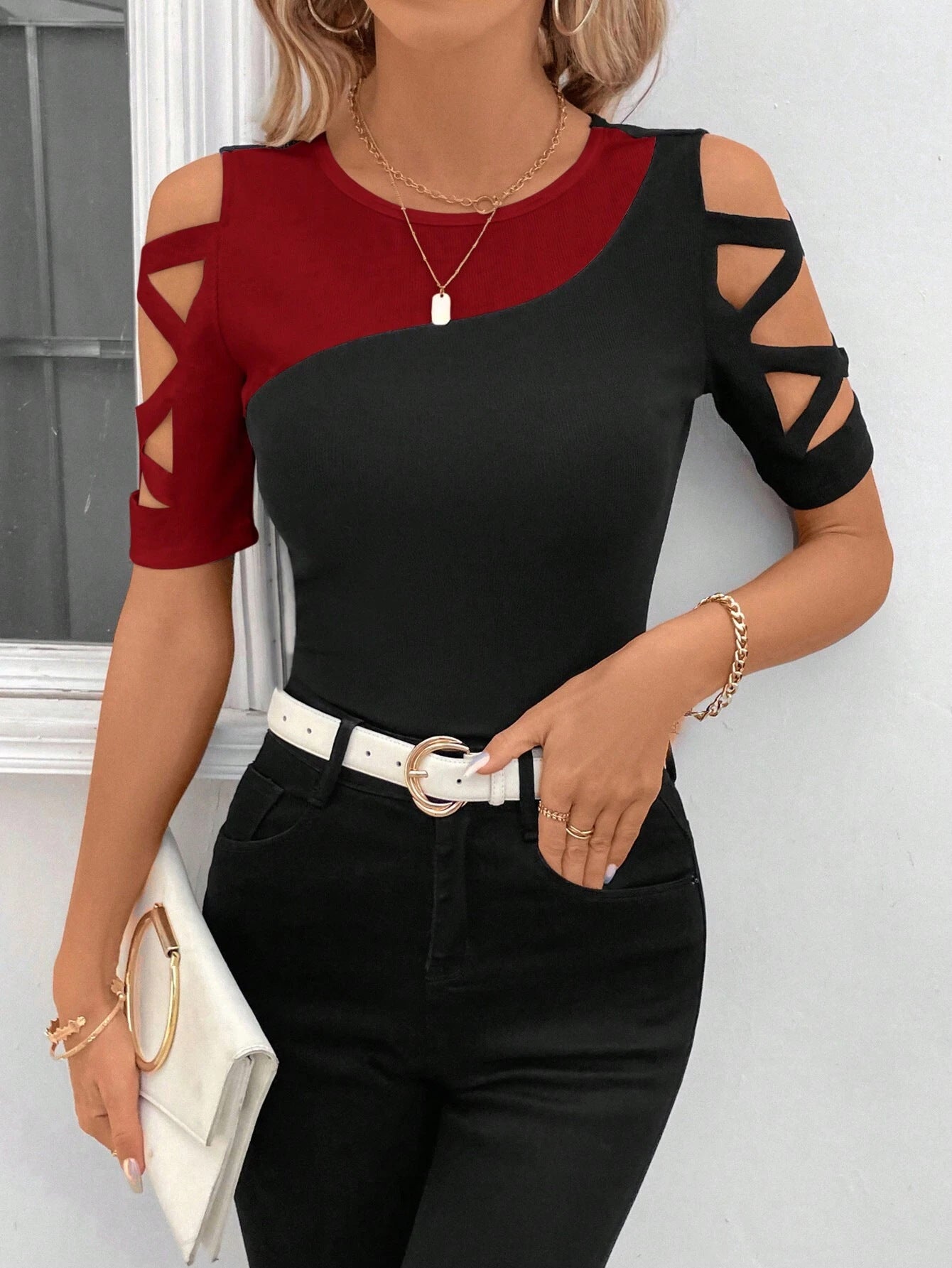 Color Matching Cross Off-the-shoulder Slim Top For Women
