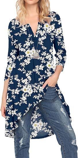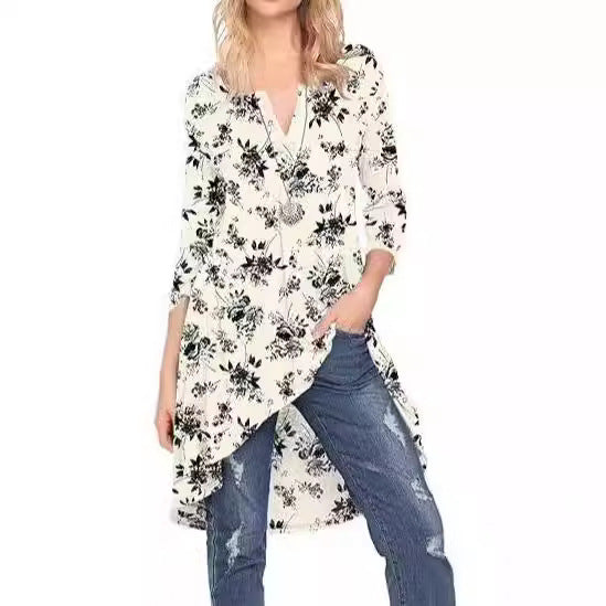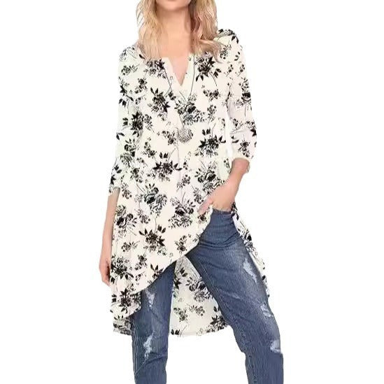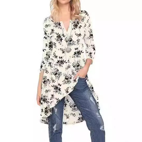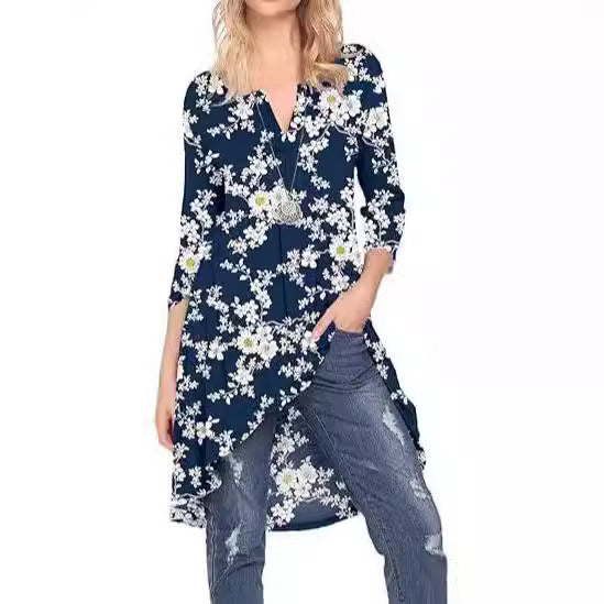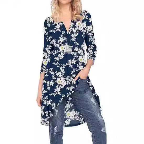European And American Leisure Long Floral V-neck Printed Mid-length A- Line Dress