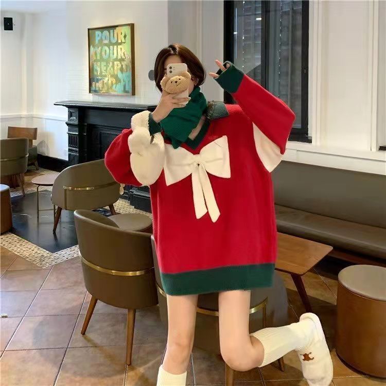 Fashion Christmas Red Bow Sweater For Women