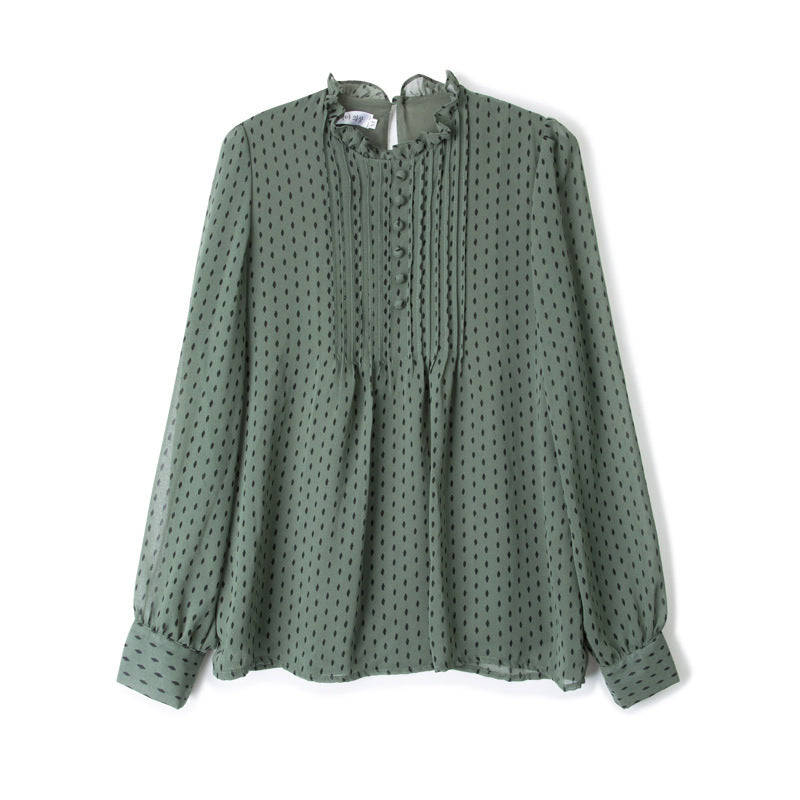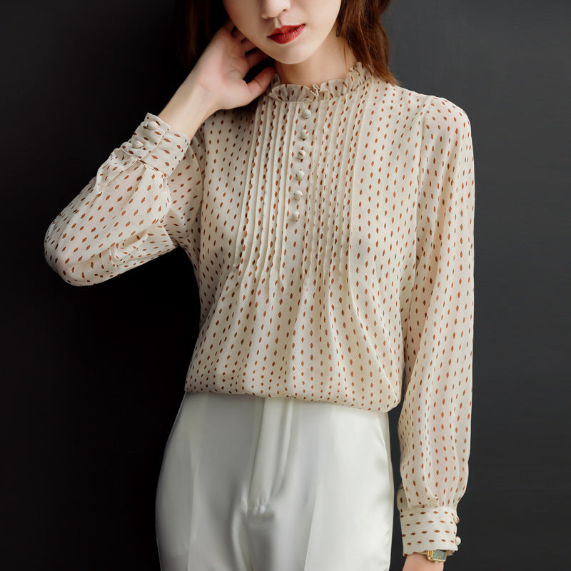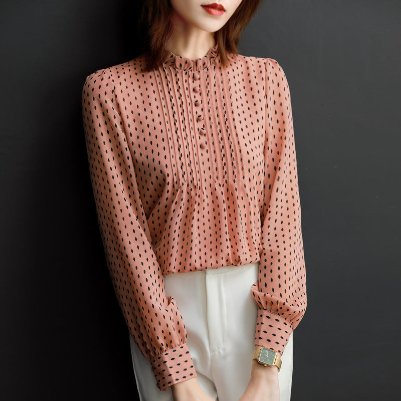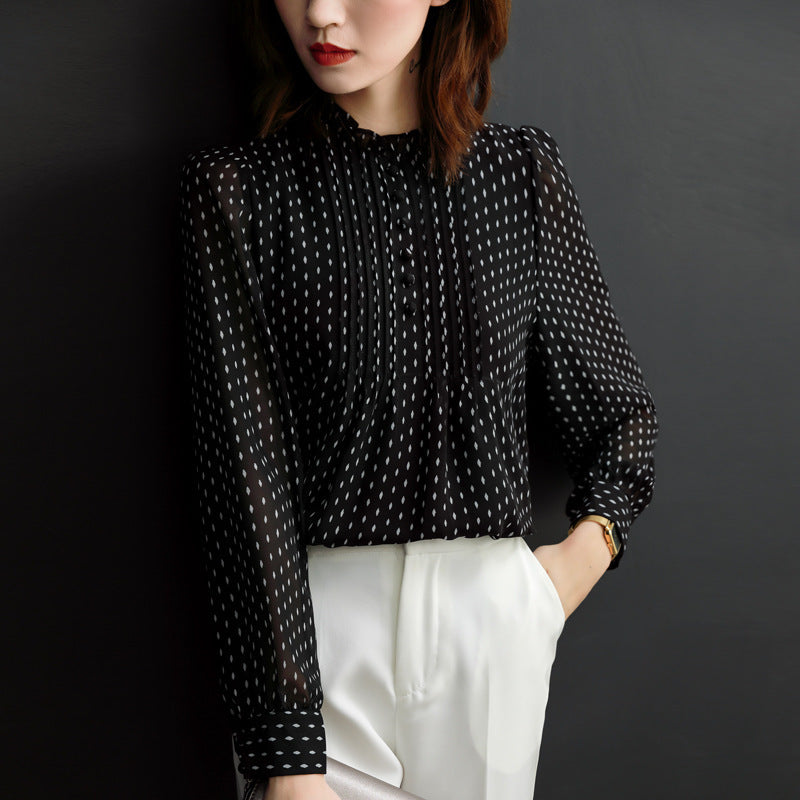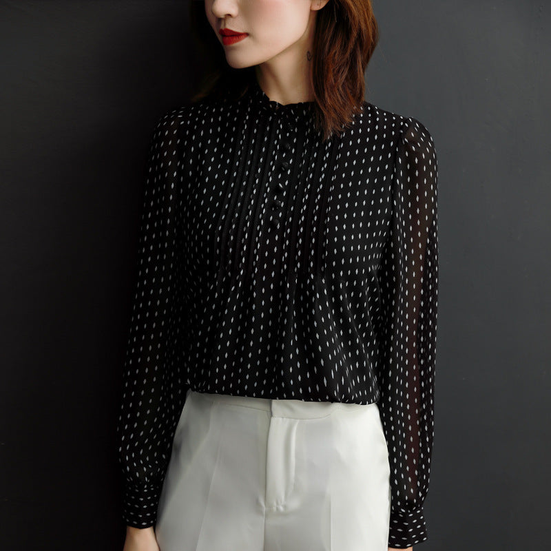 Fashion Stand Collar Polka Dot Chiffon Shirt Long Sleeve
