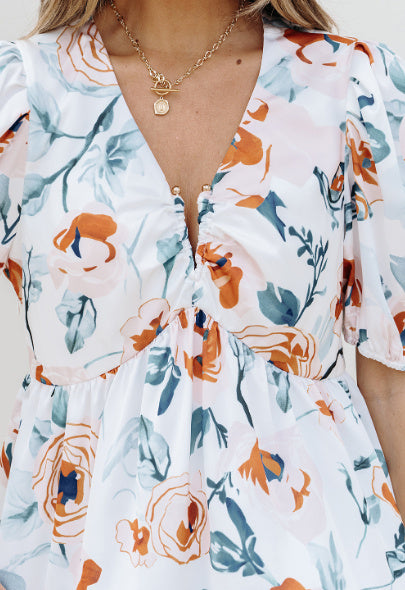 Green Floral Print Puff Sleeve V Neck Babydoll Blouse