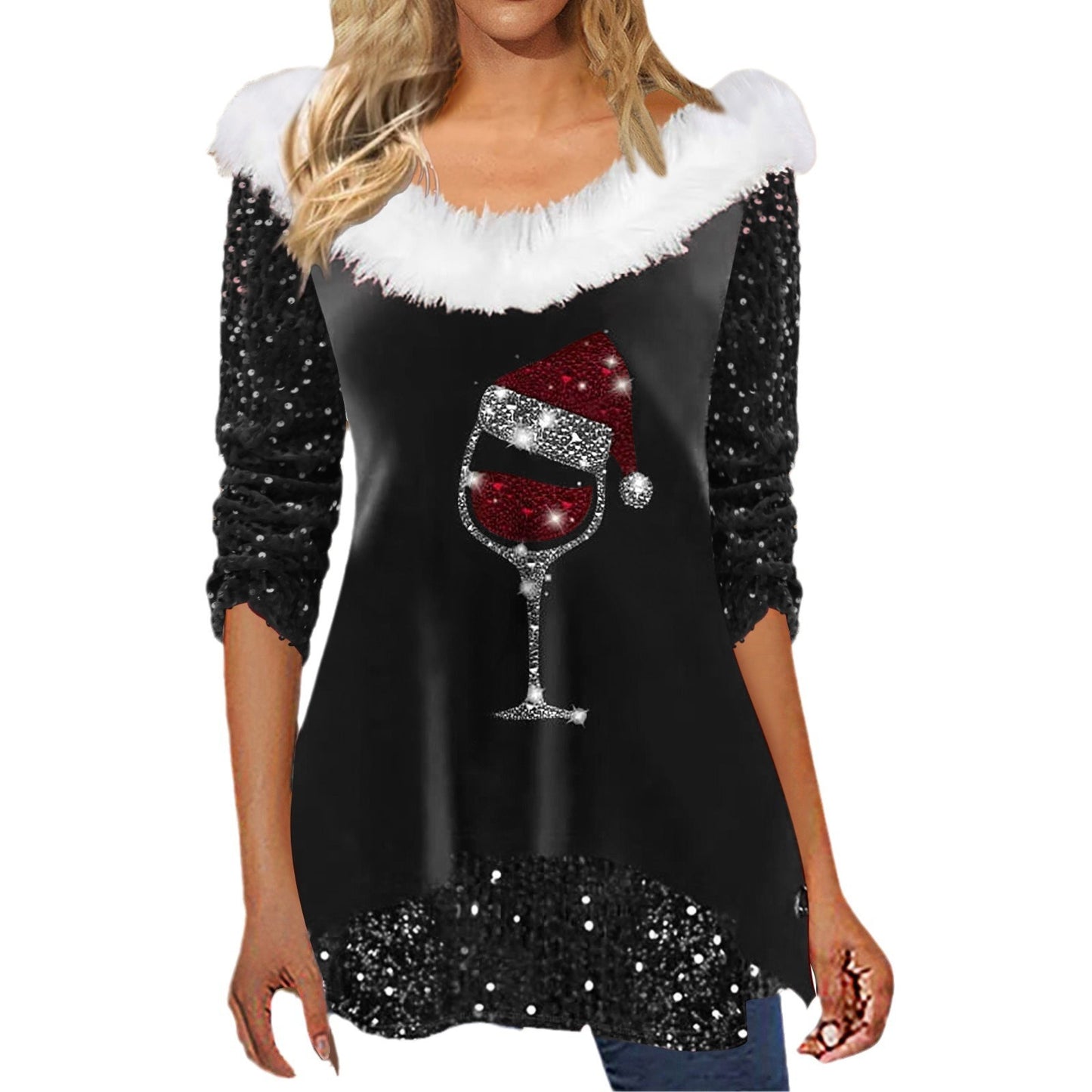 Printed Long Sleeve V-neck Pullover Fur Collar Sequins T-shirt