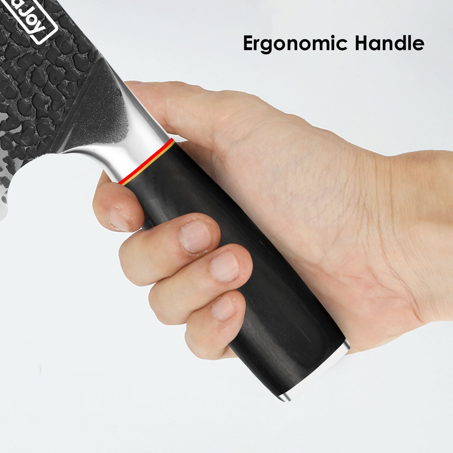 - Ergonomic G10 Handle - Chopping knife used premium wood material, not easy slip and break, both right and left hands can use easily, and this handle is ergonomic and provides a comfortable grip.