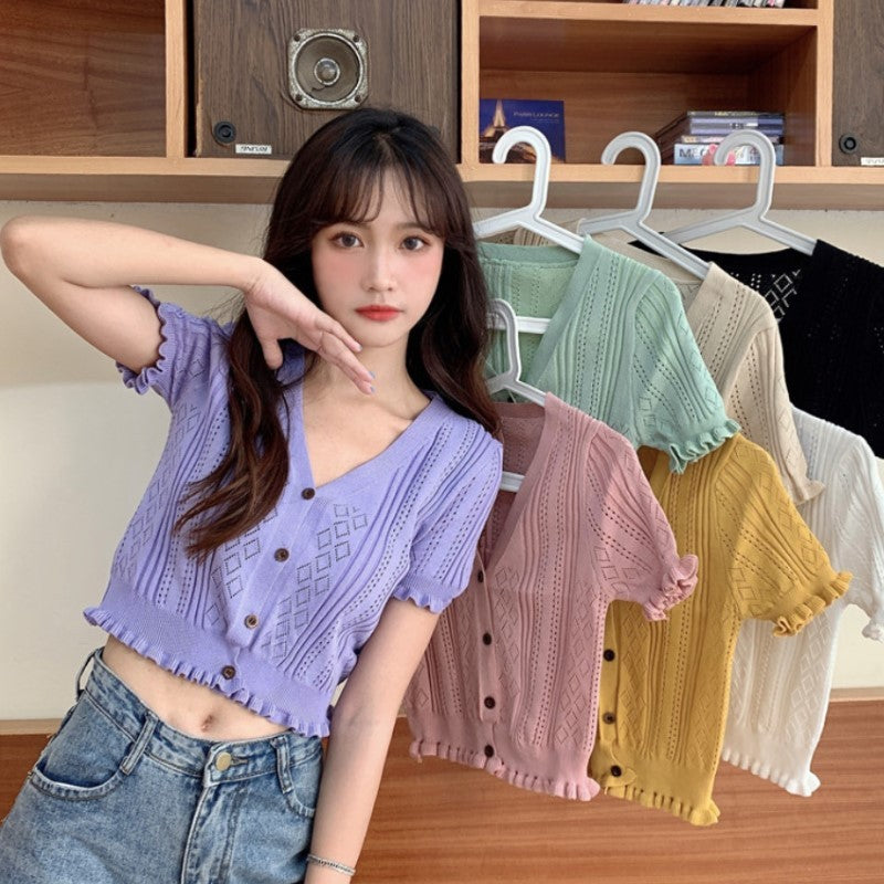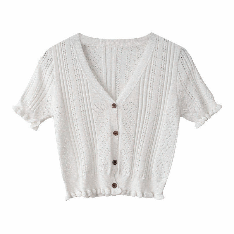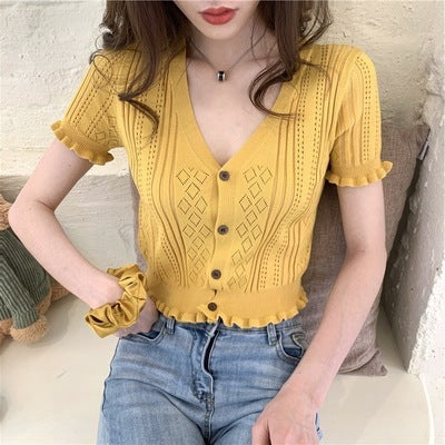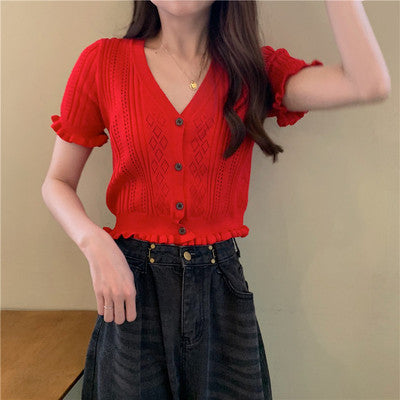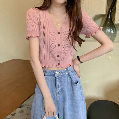 Retro V-neck Short Tup Cardigan Hollow Out Thin T-shirt