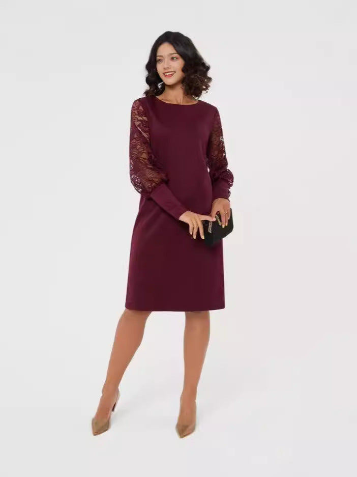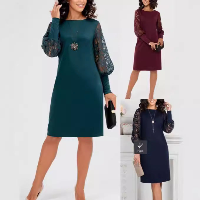 Round Neck Long Sleeve Lace Sleeve Slim Fit Patchwork Dress