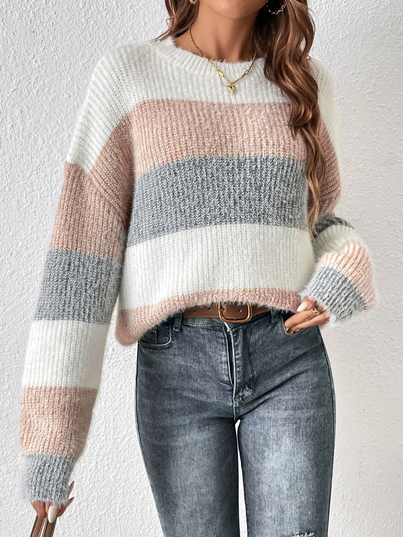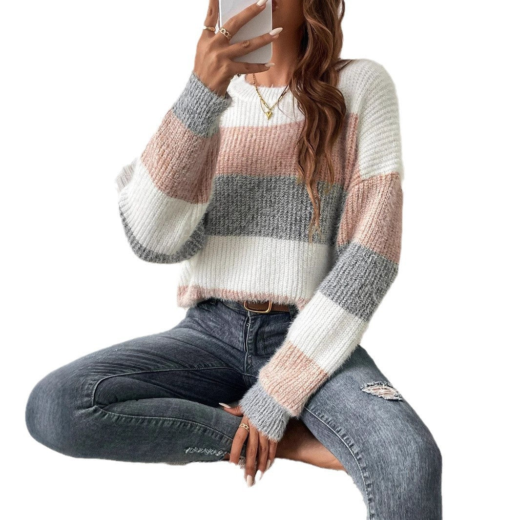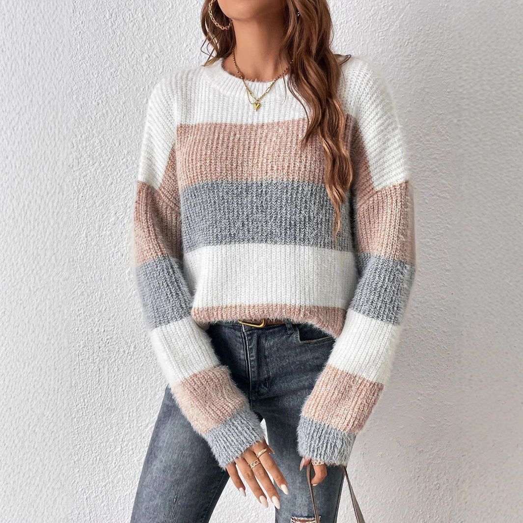 Round Neck Striped Contrast Color Women's Sweater Leisure Pullover