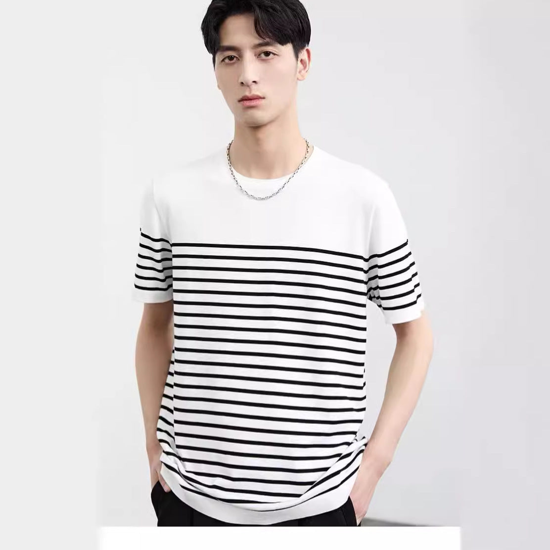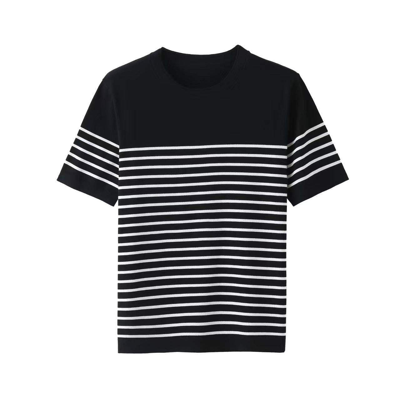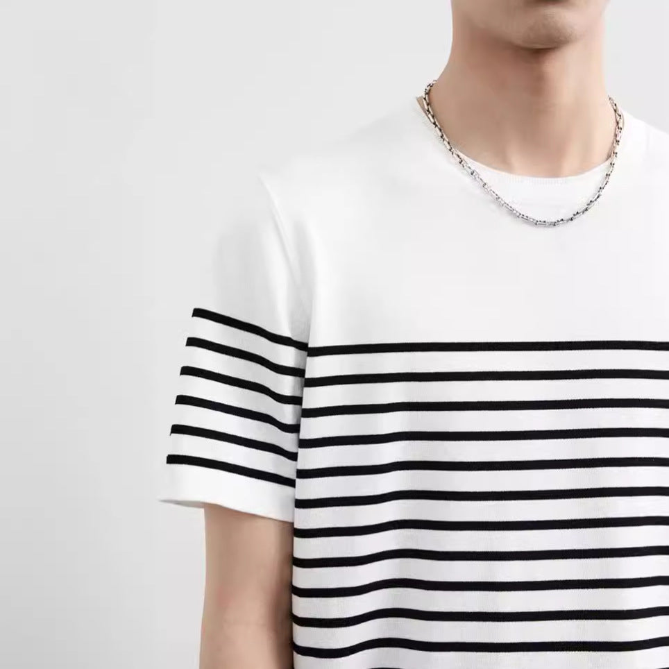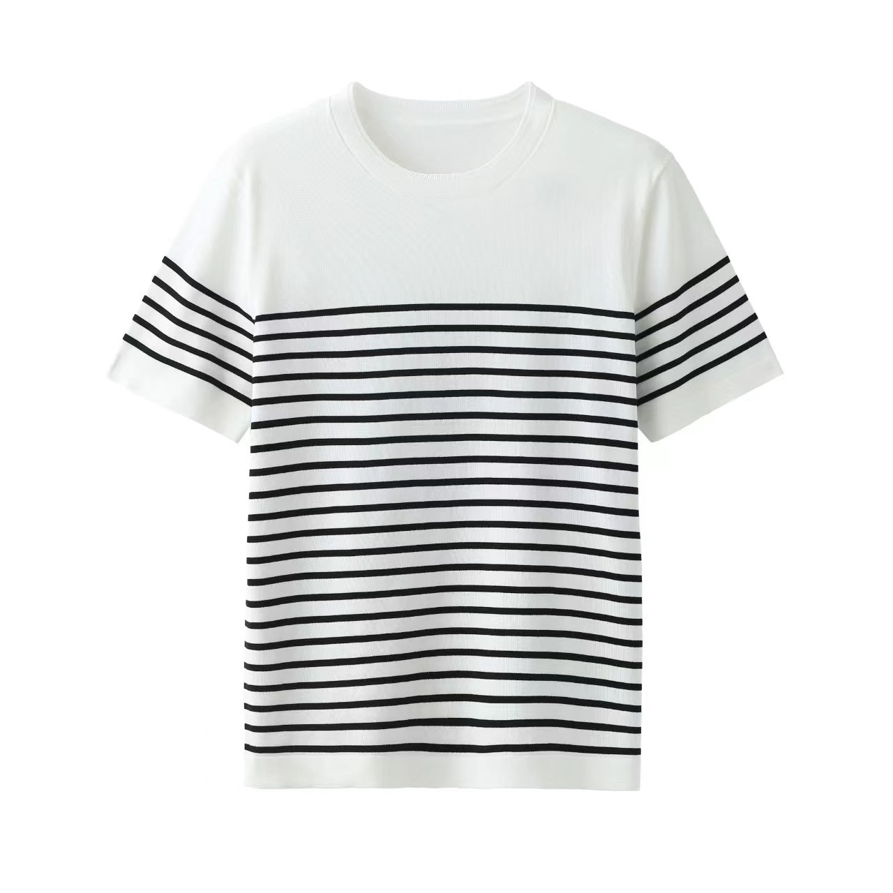Soft Retro Navy Blue Shirt Short-sleeved T-shirt Men's Knitted Striped Top