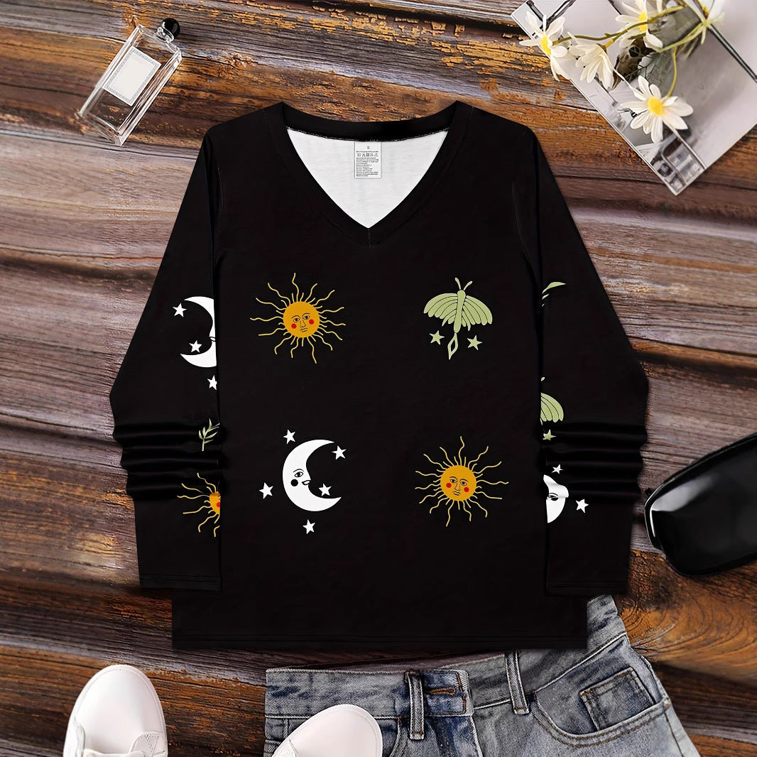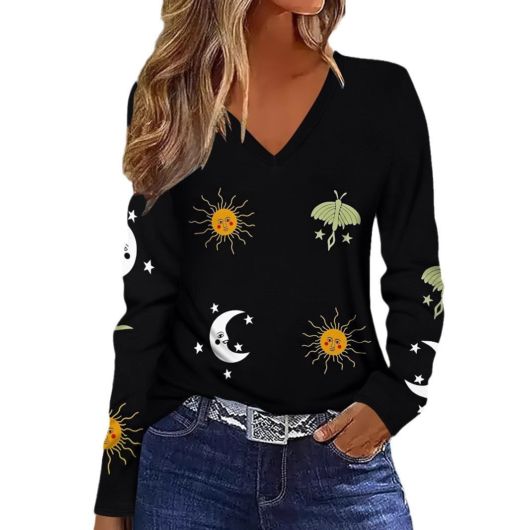 Sun Moon Star Butterfly Graphic Breathable Printed V-neck Long Sleeve T-shirt
