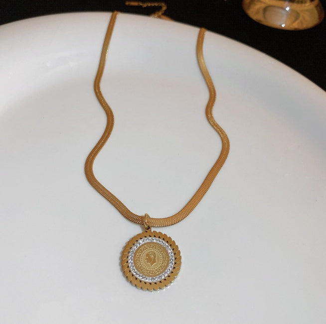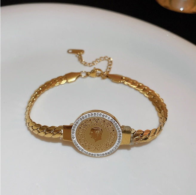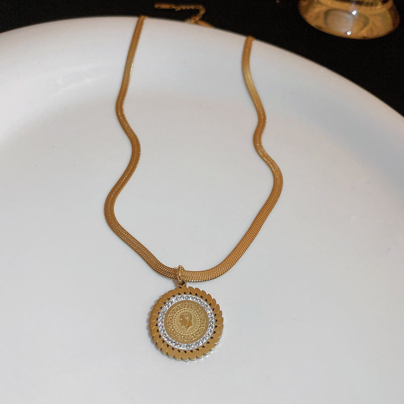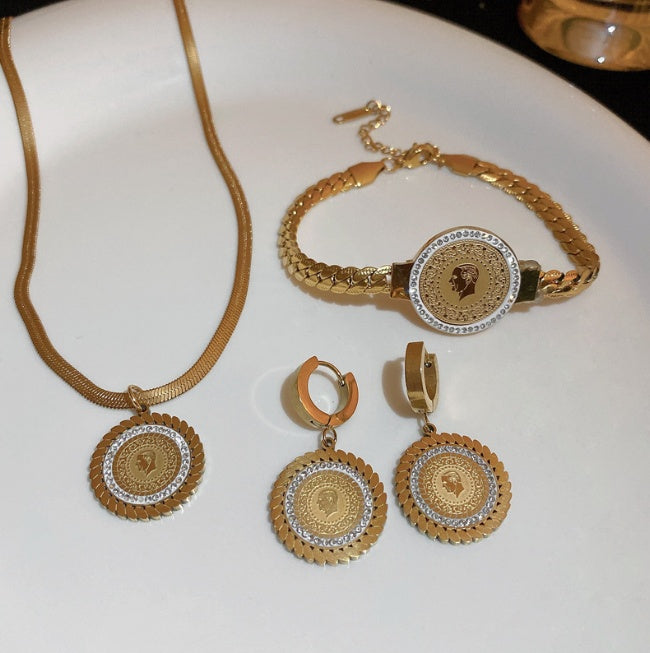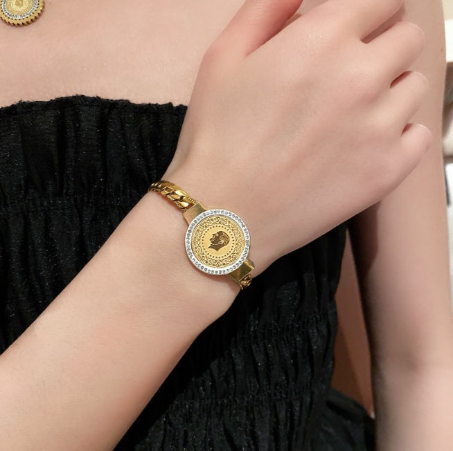 Titanium Steel Retro Affordable Luxury Diamond Portrait Round Plate Ear Clip Minority Design Earrings